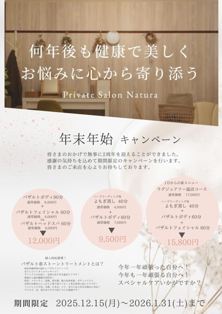 バザルトストーンケア、よもぎ蒸し、ヘッドスパ、フェイシャルをお得にお試しいただけるチャンスです!
